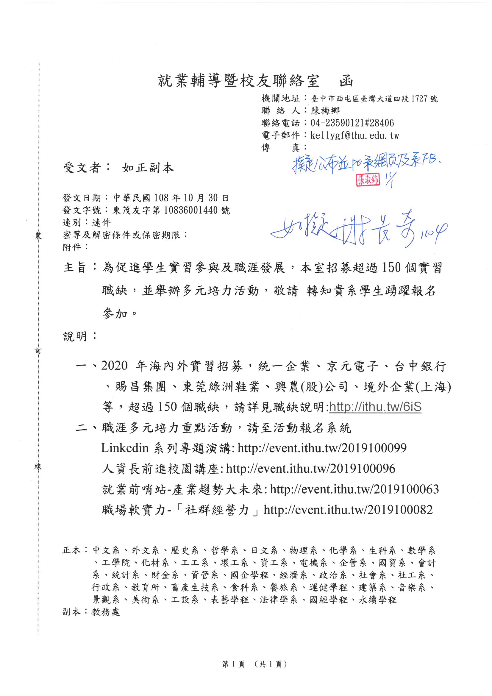 一、2020年海內外實習招募,統一企業、京元電子、台中銀行、賜昌集團、東莞綠洲鞋業、興農(股)公司、境外企業(上海)等,超過150個職缺,請詳見職缺說明:http://ithu.tw/6iS