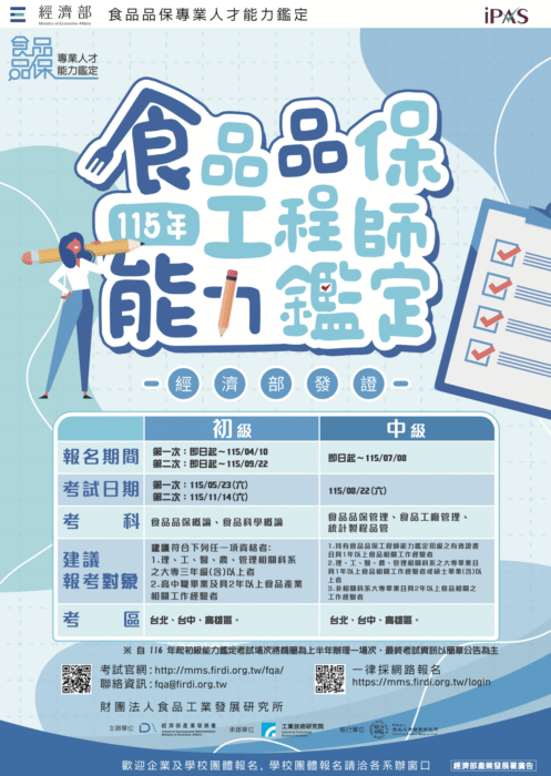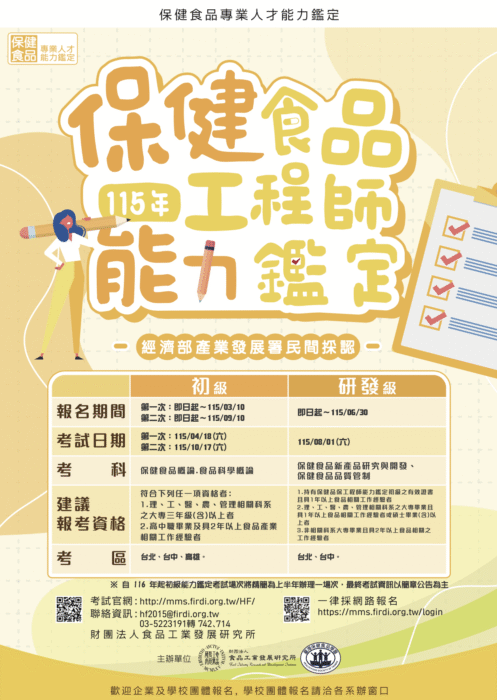 115年度「保健食品工程師能力鑑定」與「食品品保工程師能力鑑定」考試